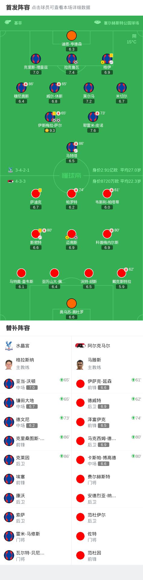 水晶宫3-1阿尔克马尔,萨尔双响,拉克鲁瓦传射,马特塔失点